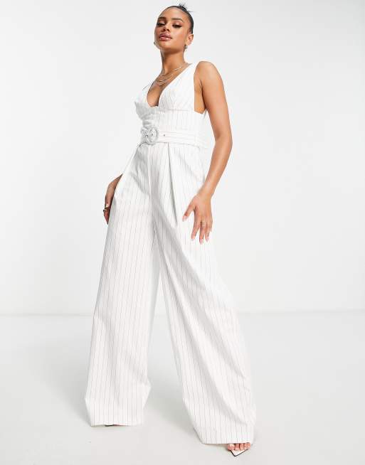ASOS DESIGN structured plunge wide leg jumpsuit with belt in pinstripe