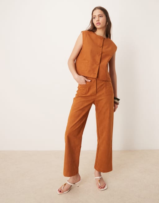 ASOS DESIGN suedette cropped straight leg trouser & boxy suedette waistcoat co-ord in tan