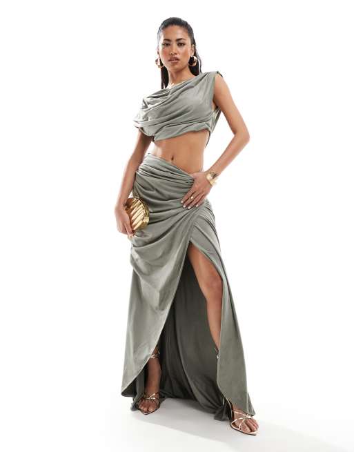 ASOS DESIGN suedette maxi dress with slashed neck in khaki green