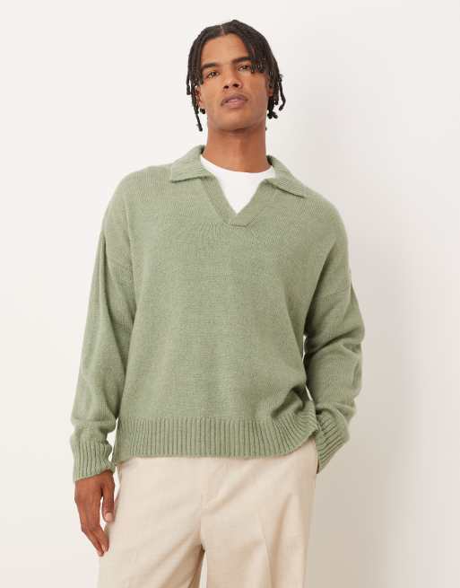 ASOS DESIGN super oversized boxy fit knitted notch neck polo in sage green marl
