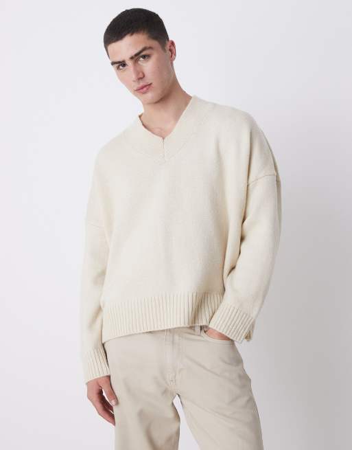 ASOS DESIGN super oversized boxy fit knitted v neck jumper in stone