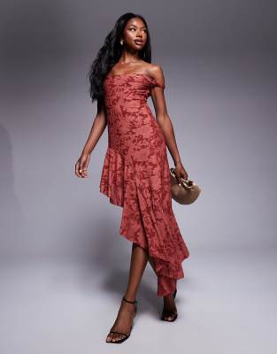 ASOS DESIGN super scooped bardot devore dress with asymmetric hem in rust