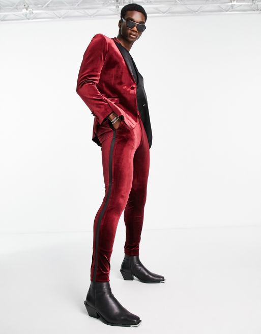 ASOS DESIGN super skinny velvet tuxedo trousers in burgundy