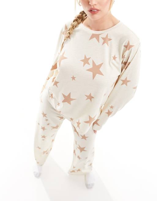 ASOS DESIGN super soft star long sleeve top & trouser pyjama set in cream