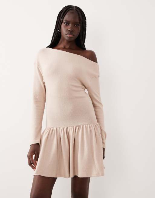 ASOS DESIGN supersoft asymmetric mini dress with dropped hem detail in cream