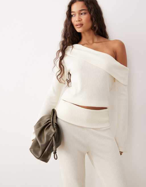 ASOS DESIGN Supersoft brushed rib long sleeve off shoulder top in white - WHITE