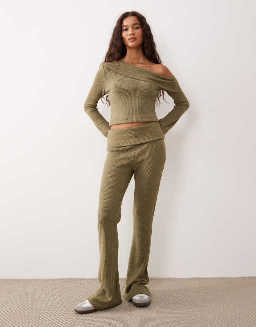 ASOS DESIGN Supersoft brushed rib wide leg trouser co-ord in khaki - MGREEN