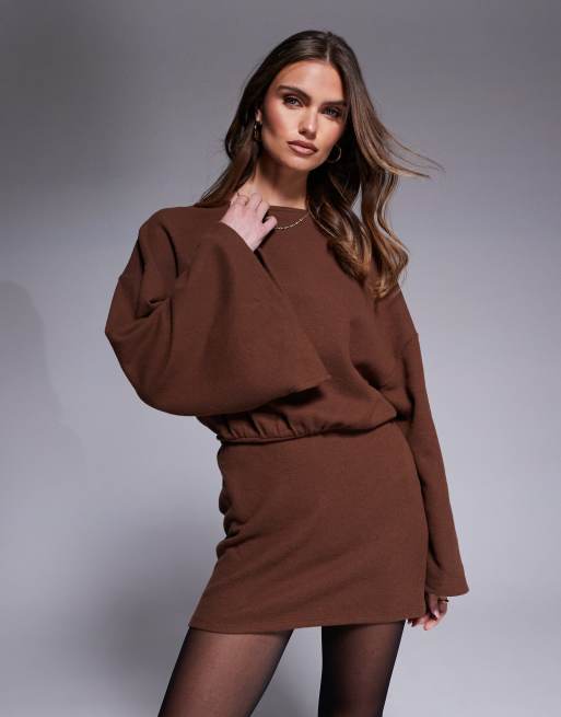 ASOS DESIGN supersoft wide long sleeve blouson mini dress in chocolate - BROWN