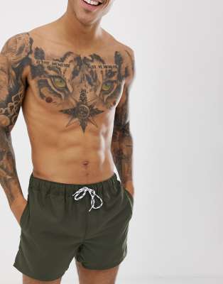 ASOS DESIGN swim shorts in khaki short length with black & white drawcord