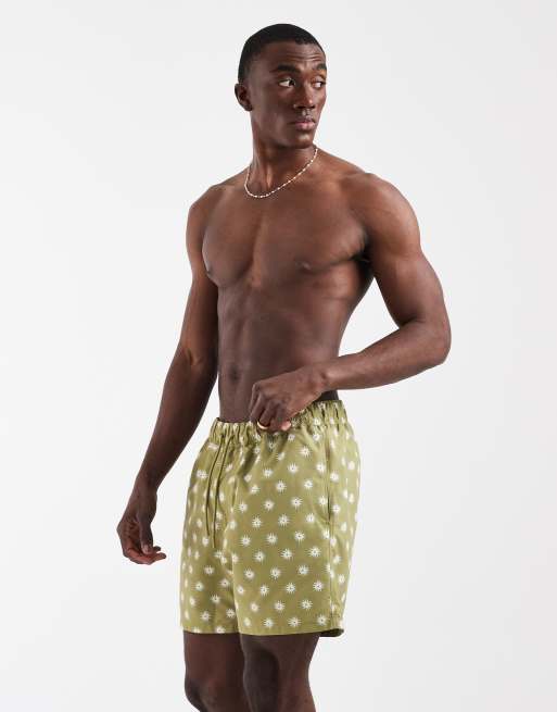 ASOS DESIGN swim shorts in mid length in micro print in green