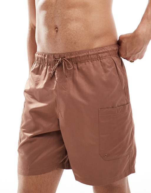 ASOS DESIGN swim shorts in mid length with cargo pocket detail in brown