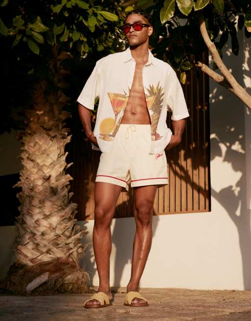 ASOS DESIGN swim shorts in short length in neutral with placement embroidery