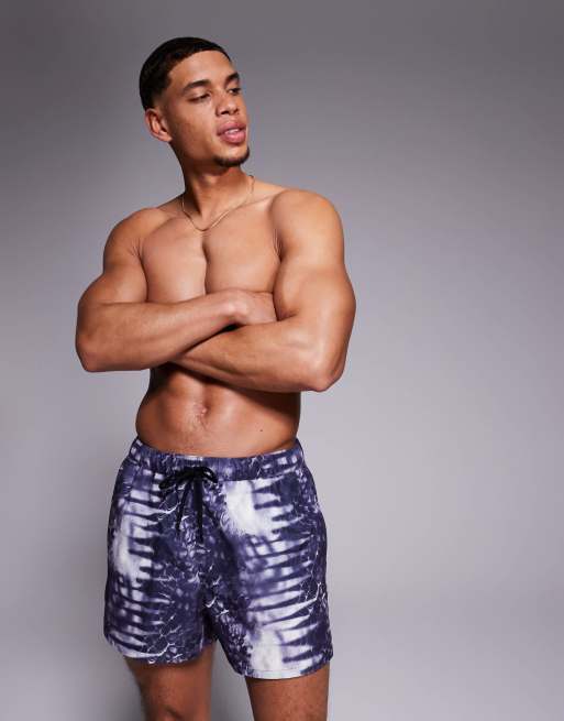 ASOS DESIGN swim shorts in short length with animal print in navy