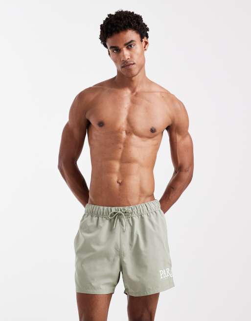 ASOS DESIGN swim shorts in short length with placement print in sage green