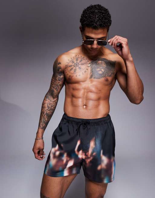 ASOS DESIGN swims short in short length with blurred photographic print in black