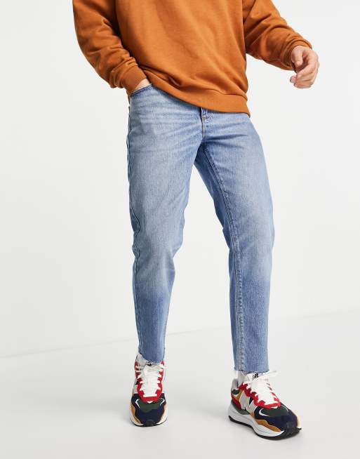 ASOS DESIGN tapered fit jeans in mid wash with raw hem - MBLUE