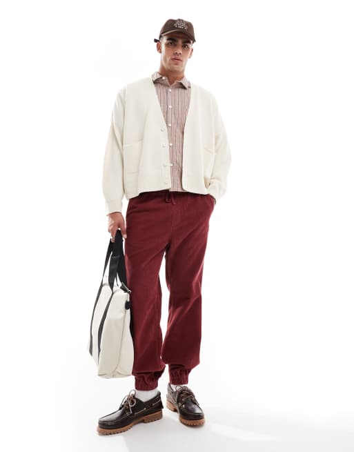 ASOS DESIGN tapered washed cord joggers in burgundy