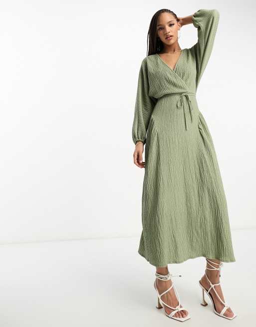 ASOS DESIGN textured crinkle wrap midi dress with tie side in khaki
