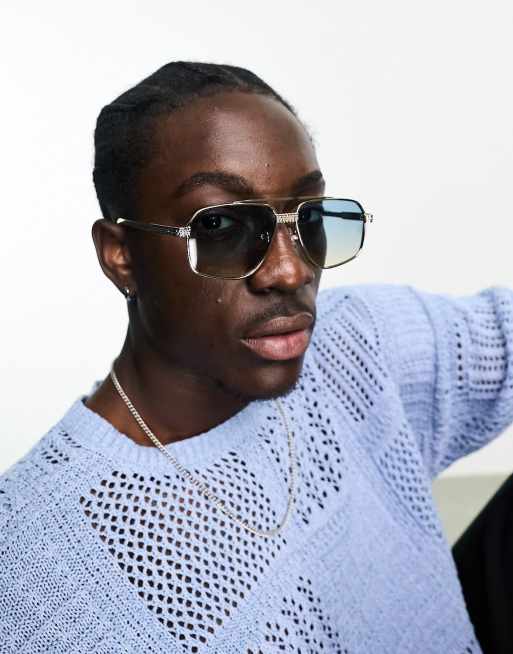 ASOS DESIGN textured metal aviator sunglasses with blue graduated lens in gold
