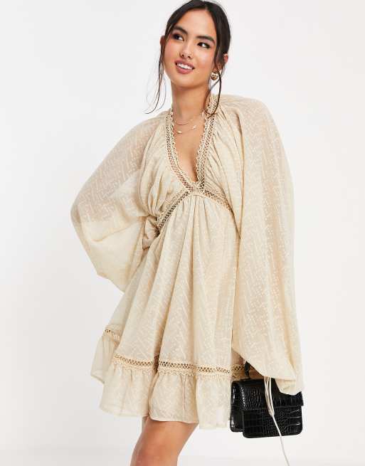 ASOS DESIGN textured midi smock dress with blouson sleeve in stone