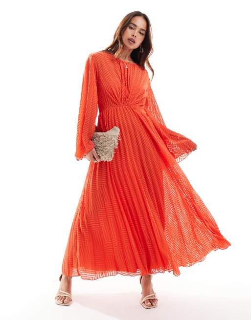 ASOS DESIGN tie back fluted sleeve pleated chevron chiffon midi dress in coral