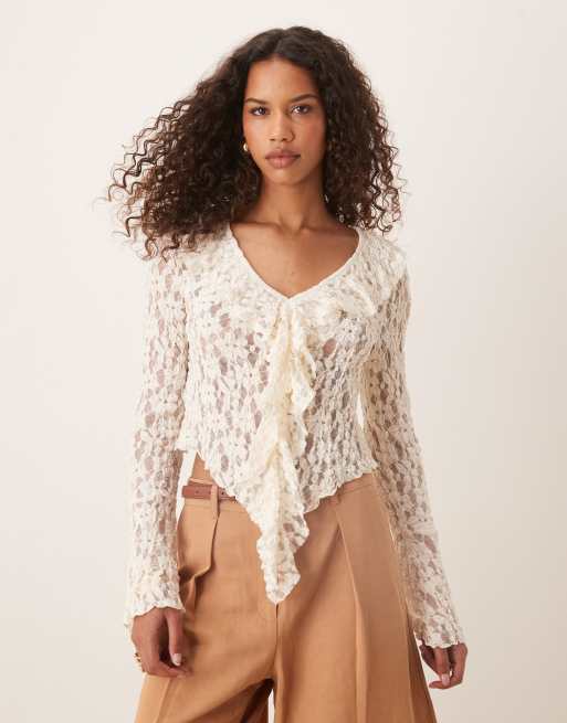 ASOS DESIGN tie front ruffle detail textured lace top in cream