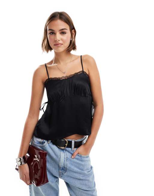 ASOS DESIGN tie side satin top with lace trim in black co ord