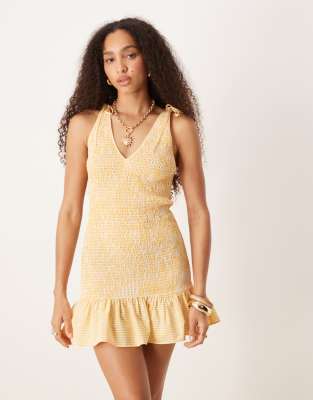 ASOS DESIGN tie strap shirred mini dress in yellow check