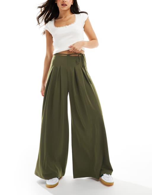 ASOS DESIGN tie waist super wide leg tailored trouser in khaki
