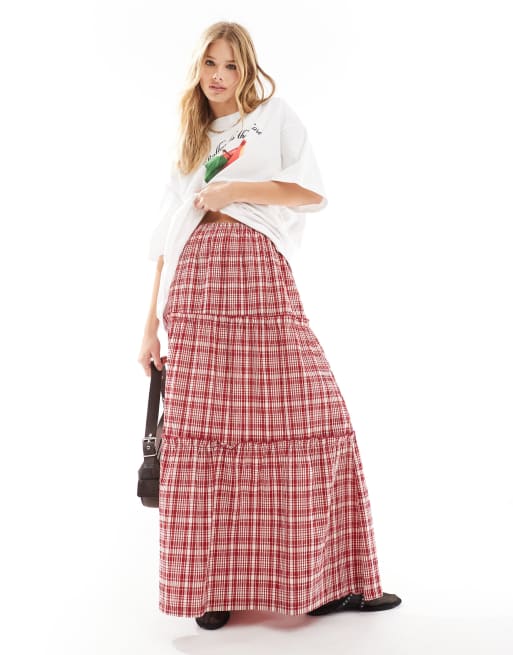 ASOS DESIGN tiered maxi skirt in red check