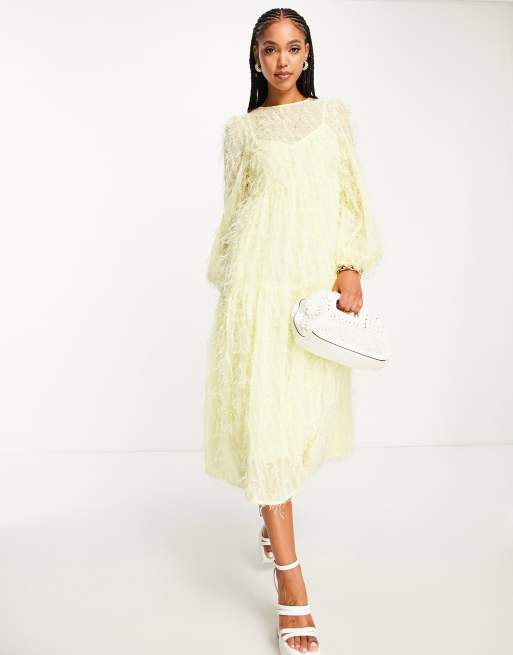 ASOS DESIGN tiered midi dress in fluffy texture in pale yellow