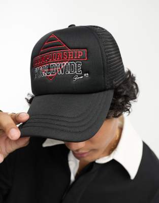 ASOS DESIGN trucker cap with text embroidery in black