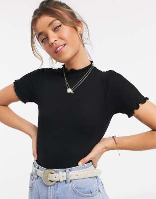 ASOS DESIGN turtle neck bodysuit with lettuce edge and half sleeve in black