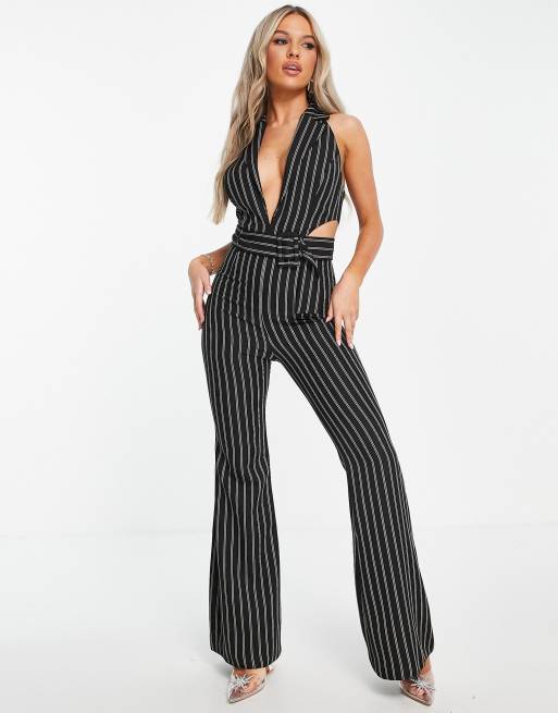 ASOS DESIGN tux halter cut out belted jumpsuit with flare leg in black pinstripe