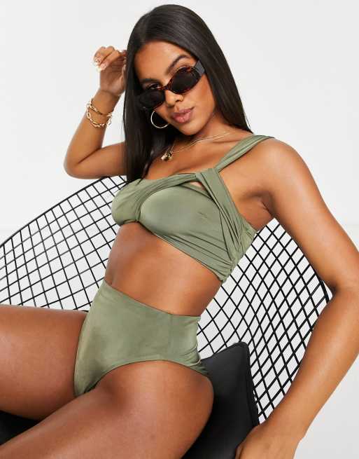 ASOS DESIGN twist drape asymmetric crop bikini top in khaki