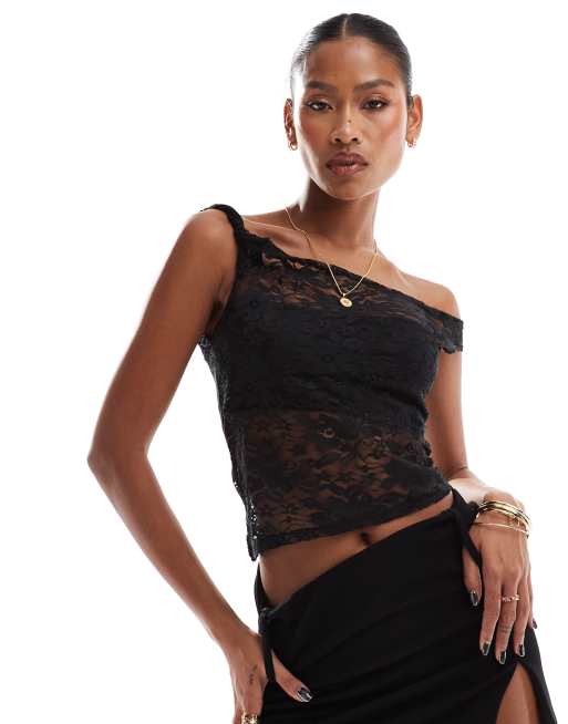 ASOS DESIGN twist off shoulder asymmetric top in black lace