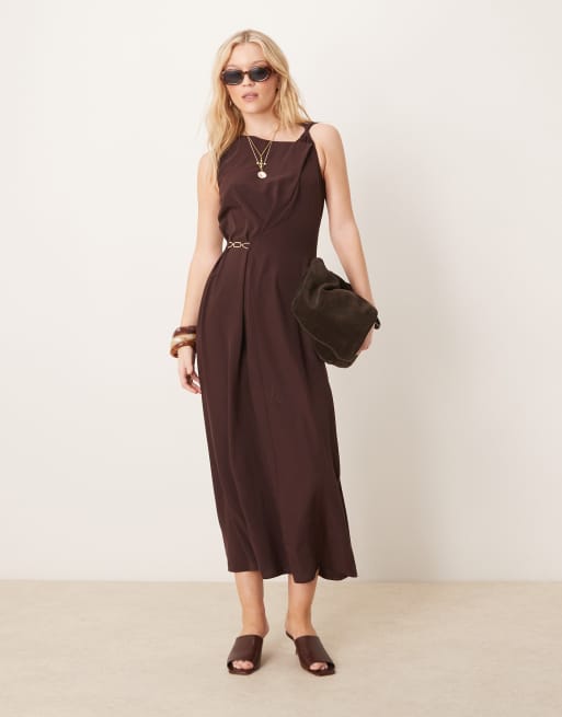 ASOS DESIGN twist strap drape midi dress with gold trim in chocolate brown