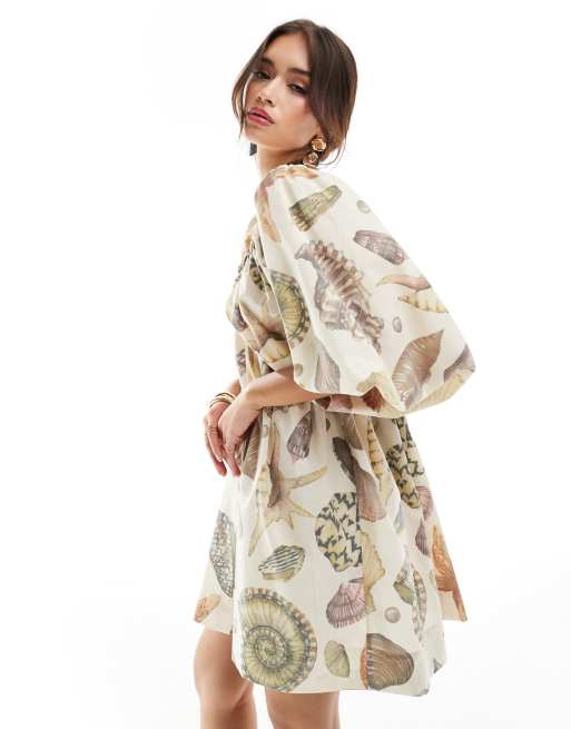 ASOS DESIGN ultimate puffed sleeve v-neck mini smock dress in shell print