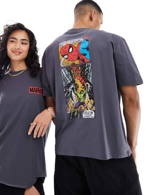 ASOS DESIGN unisex oversized license tee in charcoal with Marvel comic strip graphics