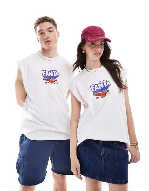 ASOS DESIGN unisex oversized license vest with Fanta Strawberry's and Cream prints in white