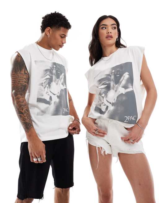 ASOS DESIGN unisex oversized license vest with Tupac graphic prints in off white
