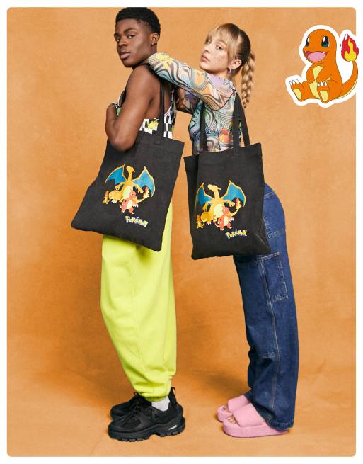 ASOS DESIGN Unisex Pokemon cotton tote bag with Charmander evolution print in washed black