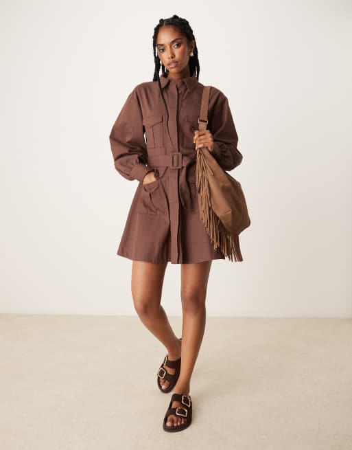 ASOS DESIGN utility shirt mini dress with belt in chocolate