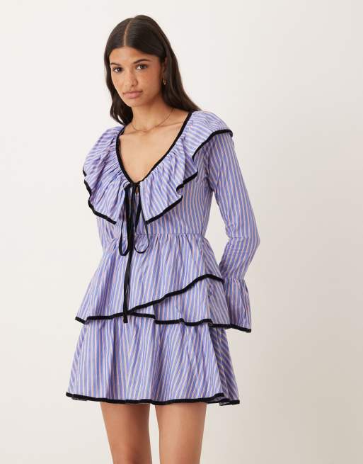 ASOS DESIGN v neck mini smock dress with tie bust and contrast velvet trim in blue stripe