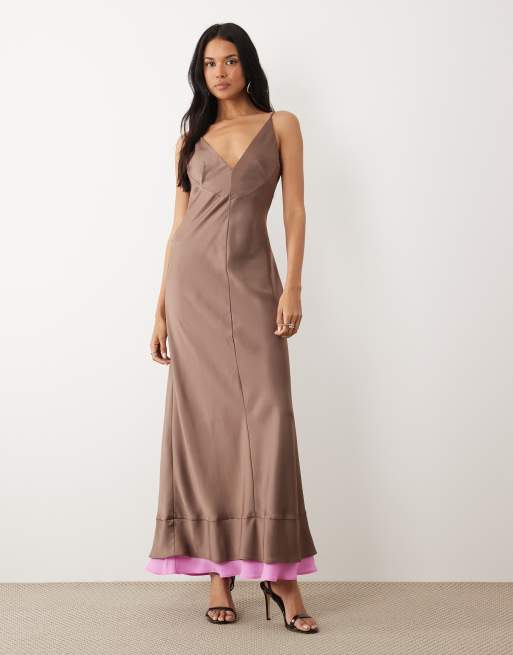 ASOS DESIGN v-neck satin double layer maxi dress in mocha and pink