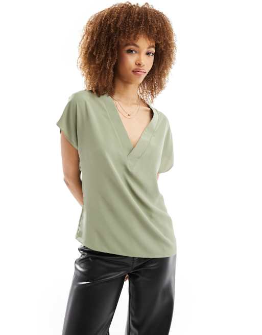 ASOS DESIGN V neck short sleeve top in light khaki