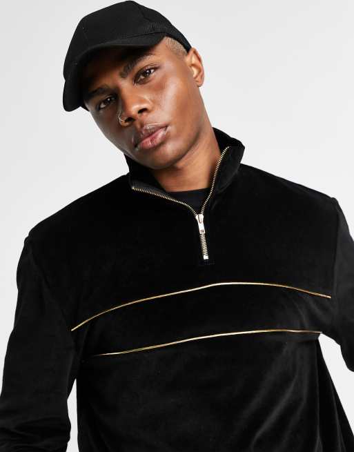 ASOS DESIGN velour sweatshirt with half zip in black with gold details