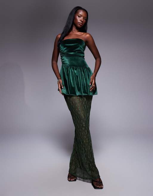ASOS DESIGN velvet bandeau peplum midi dress with lace skirt in green