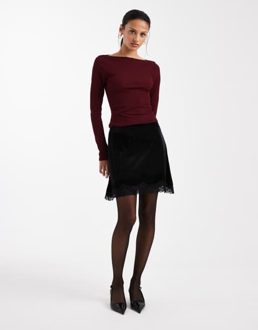 ASOS DESIGN velvet mini skirt with lace hem in black