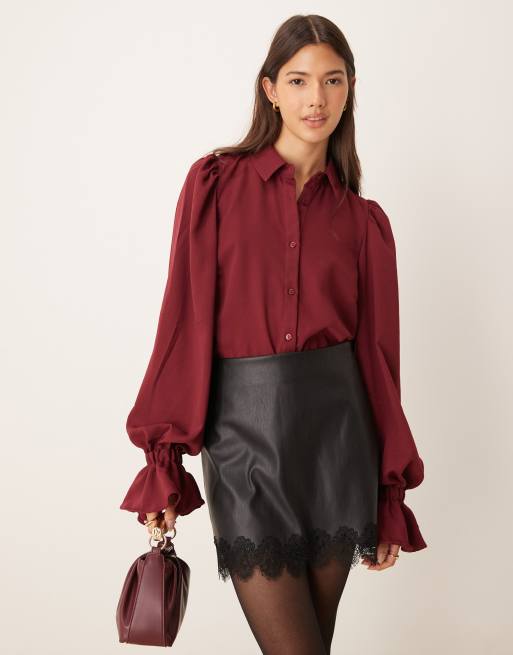 ASOS DESIGN volume sleeve ruffle soft cuff shirt in burgundy